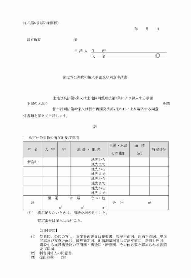 第8条 法定外公共物を土地改良法(昭和24年法律第195号)第5条又は土地区画整理法(昭和29年法律第119号)第7条により編入する承認を求める申請をしようとする者、都市計画法(昭和43年法律第100号)第32条又は都市再開発法(昭和44年法律第38号)第7条の12により編入する同意を求める申請をしようとする者は、法定外公共物の編入承認及び同意申請書(様式第6号)に次に掲げる書類及び図面を添付して都市整備課に提出するものとする。