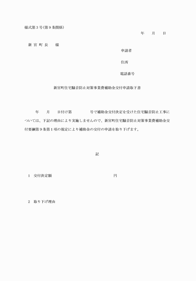 第7条 騒音防止工事に係る経費について補助を受けようとする者(以下「補助申請者」という。)は、新宮町住宅騒音防止対策事業費補助金交付申請書(様式第1号。以下「補助申請書」という。)を町長に提出しなければならない。